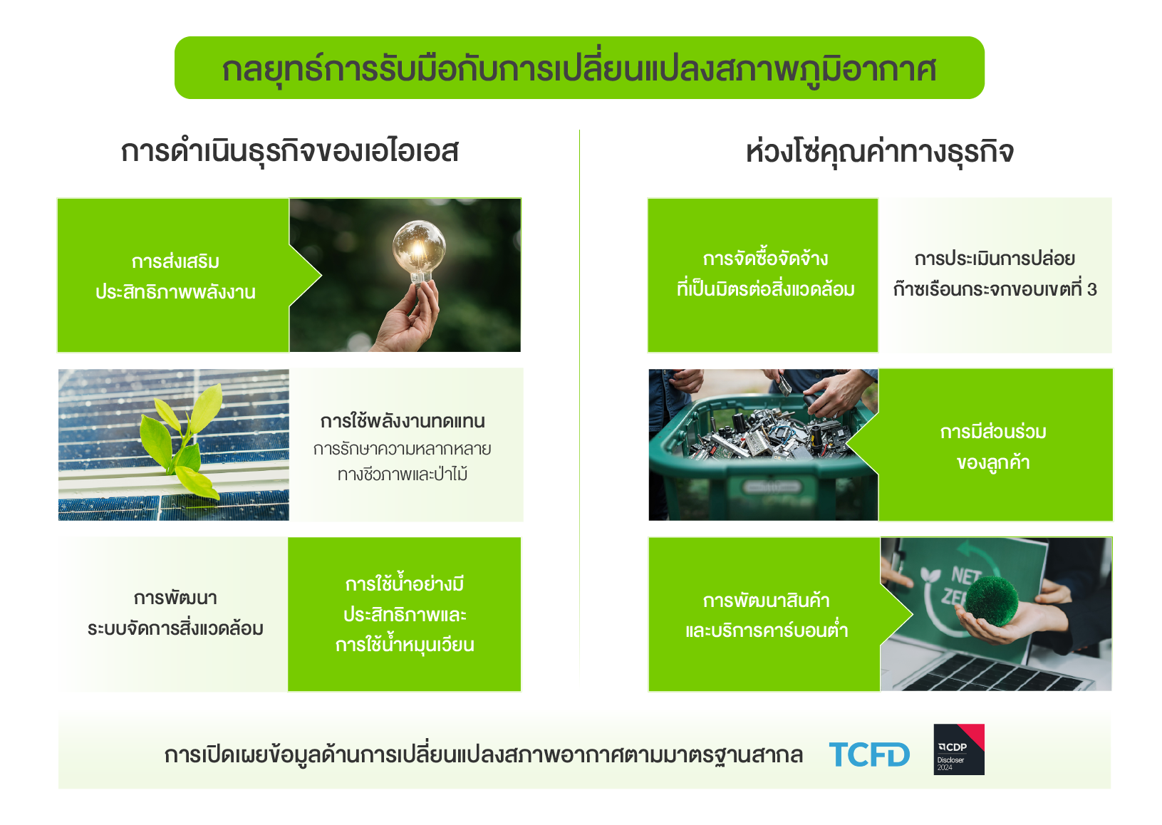 เอไอเอสตระหนักถึงผลกระทบที่อาจเกิดขึ้นจากการเปลี่ยนแปลงสภาพภูมิอากาศต่อการดำเนินธุรกิจ อาทิ (1) ความเสียหายที่อาจเกิดขึ้นต่อโครงสร้างและอุปกรณ์โครงข่ายที่กระจายอยู่ทั่วประเทศอันเกิดจากภัยธรรมชาติที่รุนแรง (2) ต้นทุนที่เพิ่มขึ้นเพื่อลงทุนและใช้จ่ายสำหรับการบำรุงรักษาอุปกรณ์ต่าง ๆ ให้สามารถรับมือและทำงานได้เป็นปกติ รวมถึงการเพิ่มขึ้นของค่าประกันภัย อันเกิดจากสภาพอากาศที่มีแนวโน้มแปรปรวนและรุนแรงขึ้นในระยะยาว (3) การเตรียมพร้อมเปลี่ยนแปลงกฎเกณฑ์และนโยบายของภาครัฐ และ (4) การคำนึงถึงพฤติกรรมผู้บริโภคที่ใส่ใจสิ่งแวดล้อมมากขึ้น ด้วยเหตุนี้ เอไอเอสจึงได้จัดทำแผนการลดการปล่อยก๊าซเรือนกระจกที่ครอบคลุมการดำเนินธุรกิจของบริษัทตลอดห่วงโซ่อุปทาน ผ่านการดำเนินงานที่หลากหลาย อาทิ การติดตั้งแผงพลังงานแสงอาทิตย์ การเพิ่มประสิทธิภาพการใช้พลังงาน และการดำเนินโครงการลดปริมาณก๊าซเรือนกระจกที่เกิดขึ้นในห่วงโซ่อุปทาน