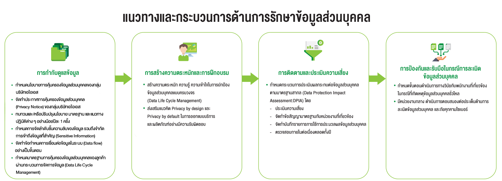 เอไอเอสกำหนดแนวทางและนโยบายการดำเนินงานการคุ้มครองข้อมูลส่วนบุคคลของลูกค้าตามกรอบของกฎหมายและข้อบังคับที่่เกี่ยวข้อง ครอบคลุมทั้งเอไอเอสและบริษัทในเครือทั้งหมด